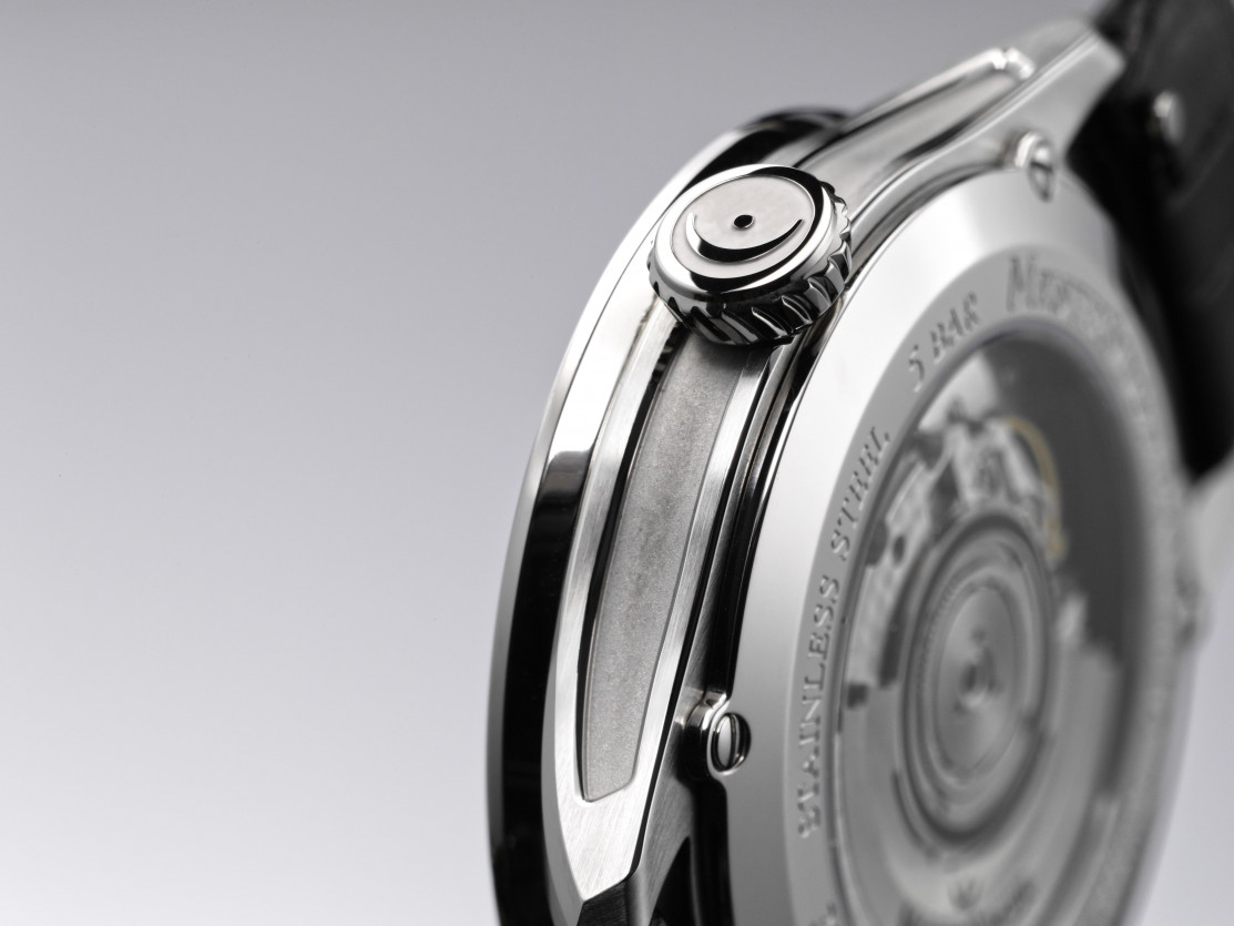 Proprio sopra la cifra 6 ruota una piccola ruota una volta al secondo, la cosiddetta “sun wheel”. È un modo discreto per confermare che l’orologio funziona, anche se non misura i secondi nel modo classico. La cassa ha un diametro di 40,5 mm e uno spessore di circa 11,25-12,3 mm, impermeabilità 5 bar (50 m). Vetro zaffiro con rivestimento AR sul davanti, fondello in vetro sul retro (si vede il modulo perlato e il rotore antracite con tre fermate). Corona a spirale, finiture miste: spazzolate, lucidate, sabbiate.